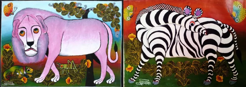 鮮やかな色づかい、そして素朴ながら味わい深い表情を浮かべる動物たち、タンザニアの野生動物や自然、人々の日常生活などを大胆な構図で描く絵画です。