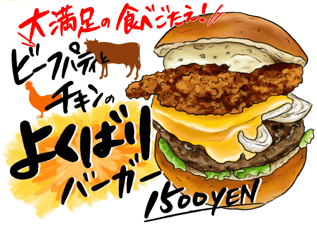 辛い食べ物が苦手な方やボリュームのあるハンバーガーを食べたい方にはもう1つの新商品、「よくばりバーガー」もおすすめですよ。