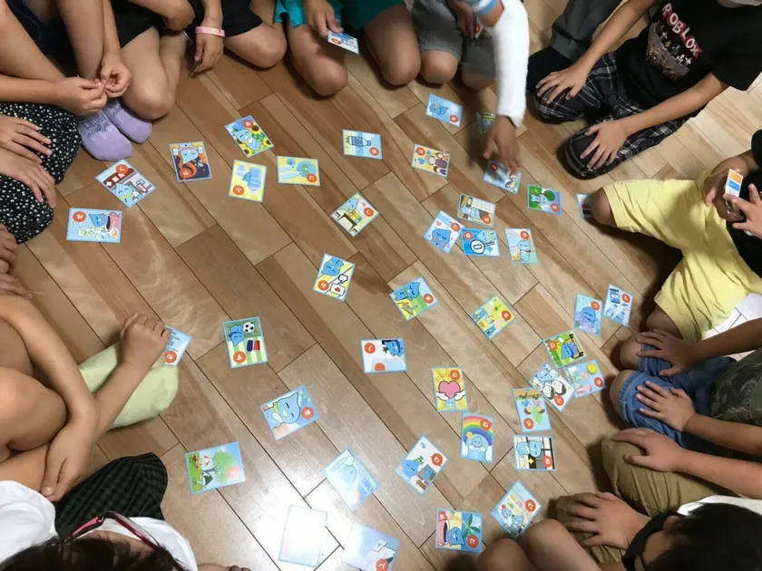 「子供がかるたで遊んでいる」