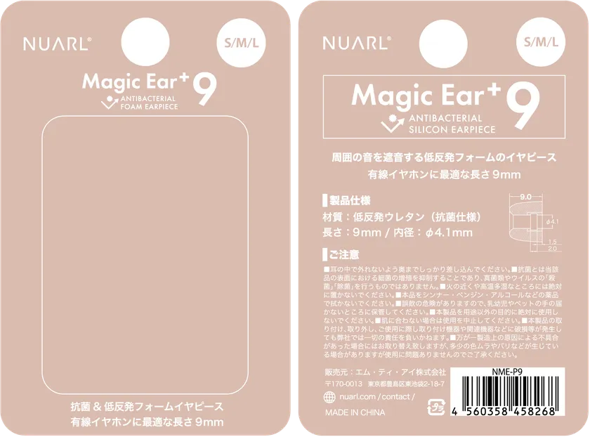 「Magic Ear+9」はフォームタイプ・イヤピースの遮音性とシリコンタイプ・イヤピースの利便性を兼ね備えた有線イヤホンに最適な長さ9mmの低反発フォームイヤピースです。
