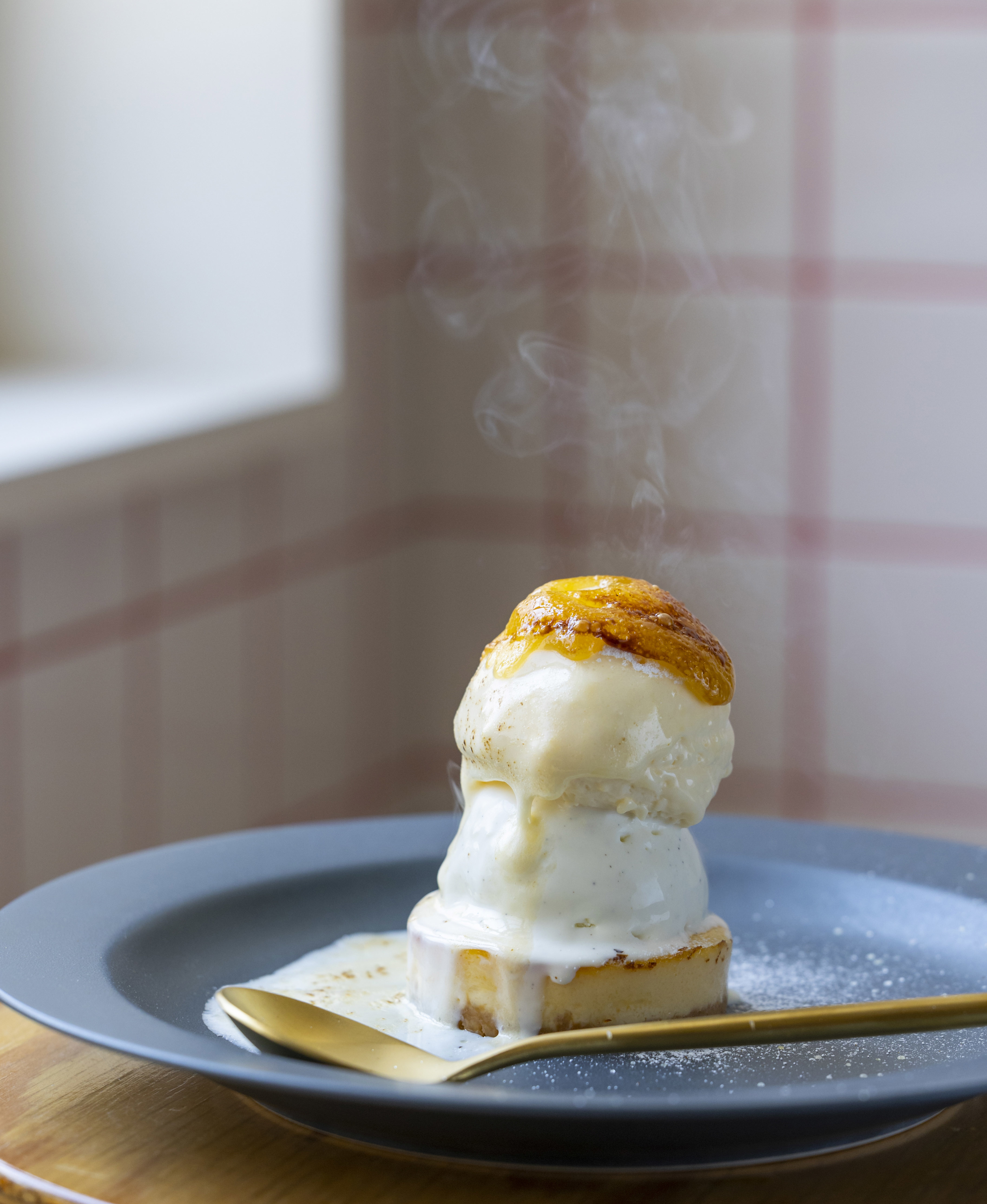 一番下の土台には、ザクっとビスケットを忍ばせたバスクチーズケーキを使用し、その上には濃厚バニラアイスと軽やかなカマンベールチーズムースをのせ、レモンソースと粉糖をトッピング。提供する際は、お客様の目の前でバーナーで炙り仕上げます。レモンソースと粉糖がブリュレされ、下に落ちながらコーティングされたら食べごろ!ブリュレ仕立ての香ばしさが引き立てる濃厚なチーズの味わいと、上はパリッと下はとろ~り冷たい新食感をおたのしみいただけます。