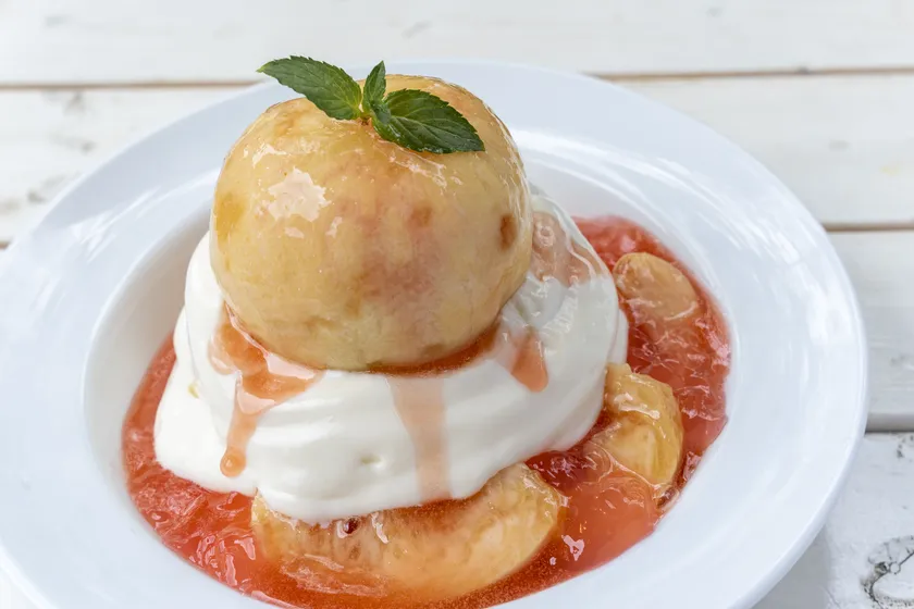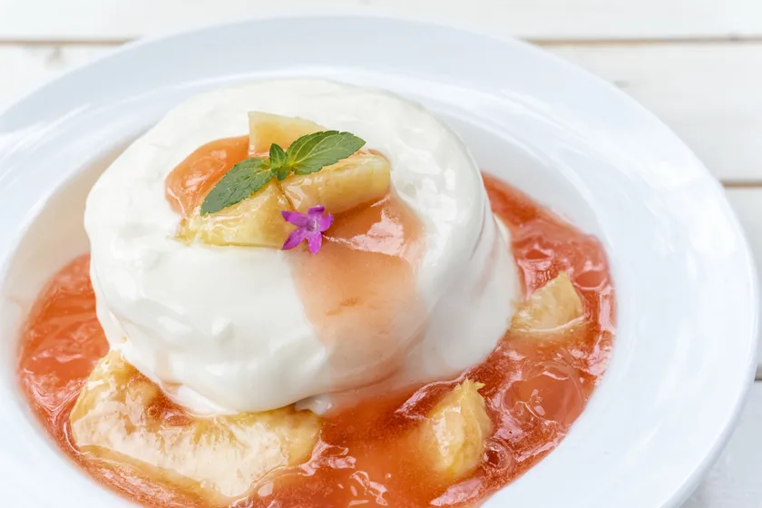 こちらも、パンケーキは焼きたての温かいふわふわな状態か一度冷やしてしっとりとした状態かお選びいただけます。爽やかなヨーグルトソースと桃の果肉が冷やしたパンケーキと絶妙に合います。