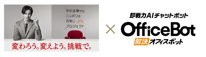 この度、「中小企業の成長支援を通じて社会をより良く変えていく」という趣旨に賛同して本プロジェクトへ参画するとともに、公式アンバサダーであるウエンツ瑛士さんを【OfficeBot】のプロモーションに起用することとなりました。これにより広告宣伝など各種プロモーション活動における発信力の強化、およびサービス提供のさらなる拡大を図り、企業のDXやビジネスイノベーション支援を通じて豊かな社会づくりに貢献してまいります。