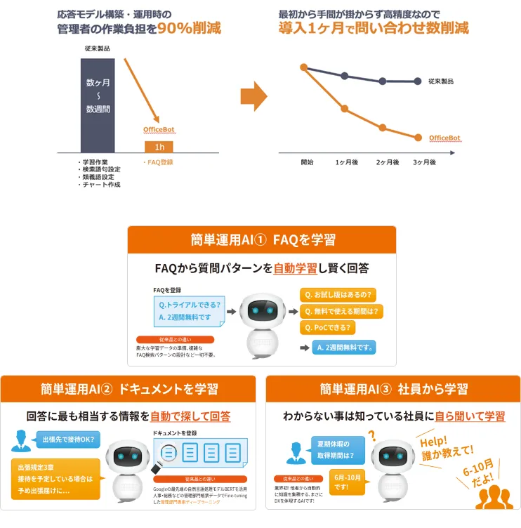 独自開発のAIにより専門知識がなくとも導入直後から高性能なチャットボット運用を可能にし、手間やコストをかけることなく短期間で導入効果を発揮する“即戦力”なAIチャットボットサービスです。質問を自動予測して適切な回答を提示する会話AIや、質問に対して規定・マニュアル・帳票などのドキュメントデータから回答を探して提示するAI、ユーザーから情報を収集・学習するナレッジ集積機能などにより、組織における業務改善や効率的なDX化を実現いたします。