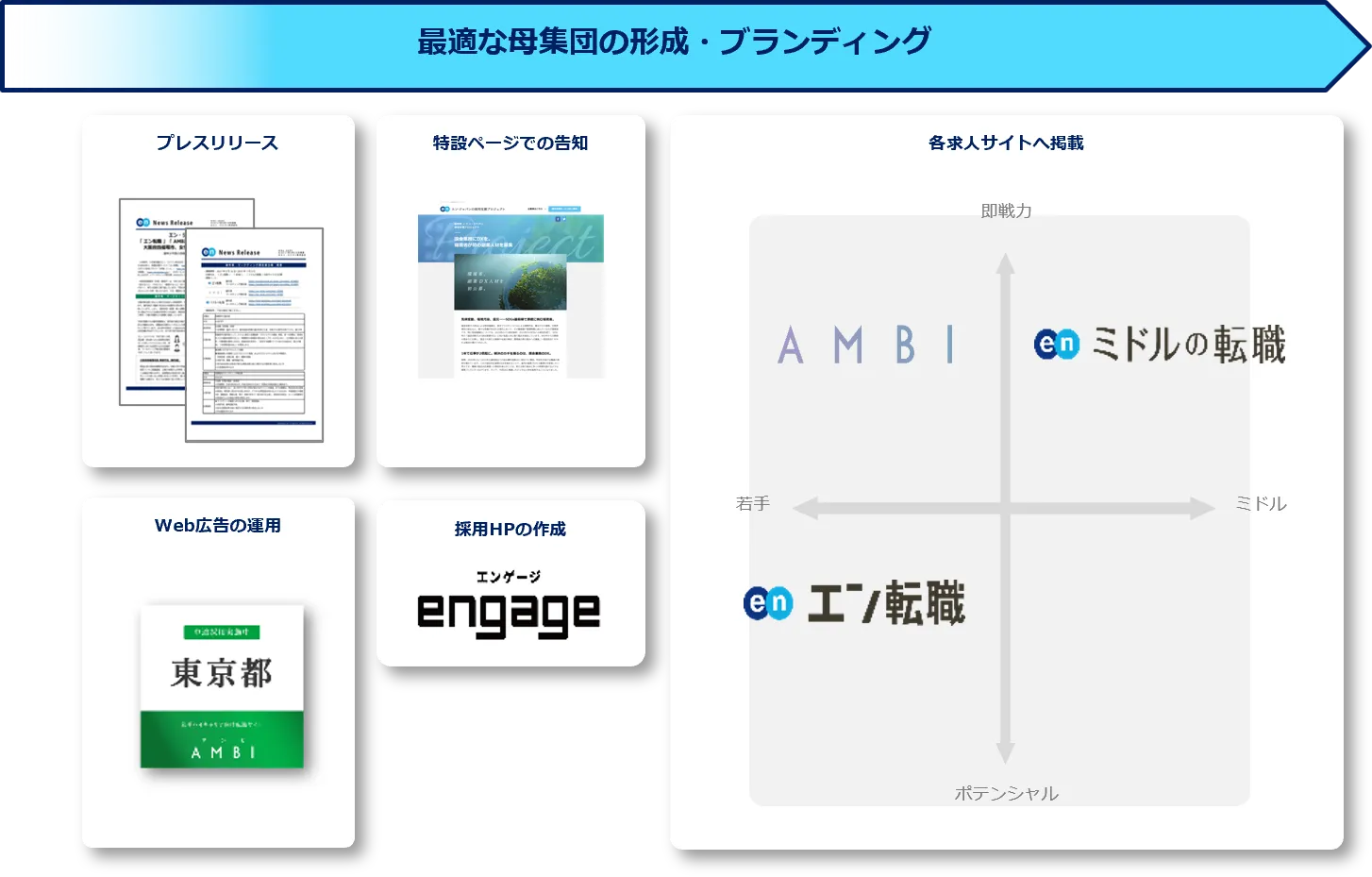 プレスリリースや特設ページ、採用HPの作成、Web広告での告知に加え、各求人サイトでの集客サポートを実施いたします。『エン転職』『AMBI』『ミドルの転職』とターゲットの異なる求人サイトを活用することで、ターゲットへ網羅的に求人を届けます。