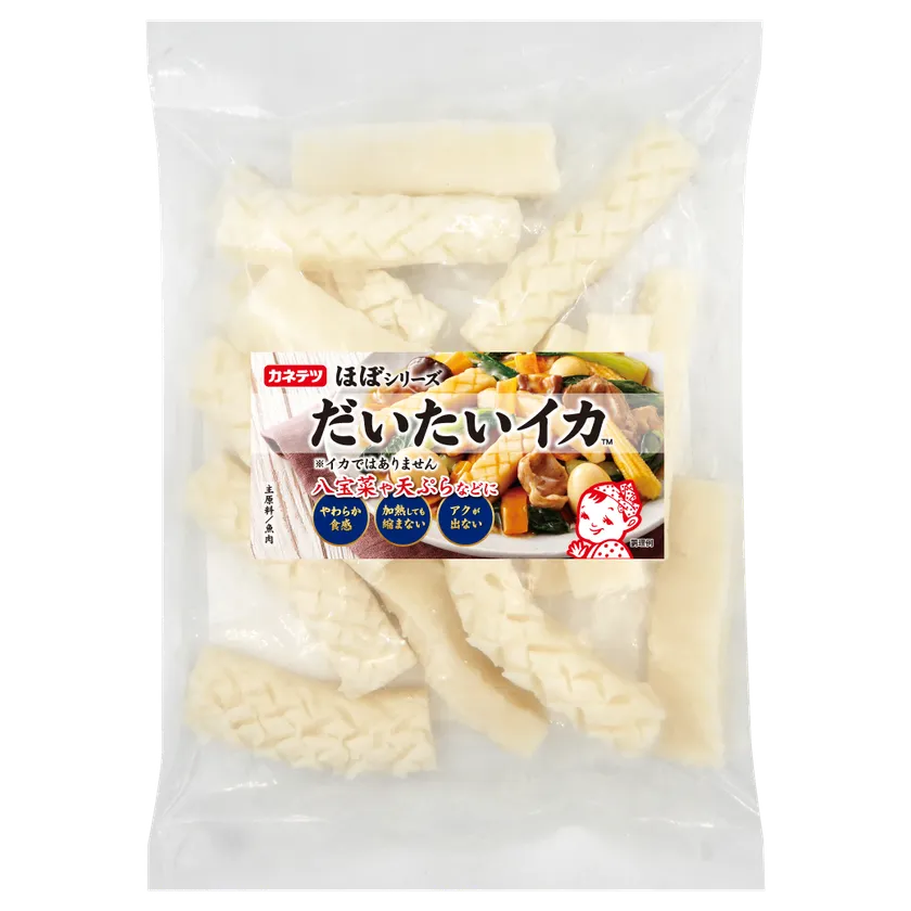 本物のイカは加熱すると縮みやすく、大きさを保つことが難しいですが、「ほぼシリーズ だいたいイカ」は熱で縮みにくいため、料理にボリュームを出すことができます。また、やわらかさもキープでき、本物のイカはかたく、噛みにくいと感じる方にも召し上がりやすい食感です。