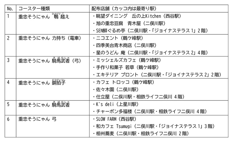 イベント期間中、ジョイナステラス二俣川や沿線の対象店舗(合計17店舗)をご利用し、アプリ内クーポンを提示いただくと、特典を受けられる他、各店舗先着300人にオリジナル「重忠そうにゃんコースター」(全6種類)をプレゼントします。