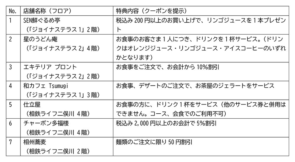 ■ジョイナステラス二俣川のクーポン対象店舗と特典〔7店舗〕
