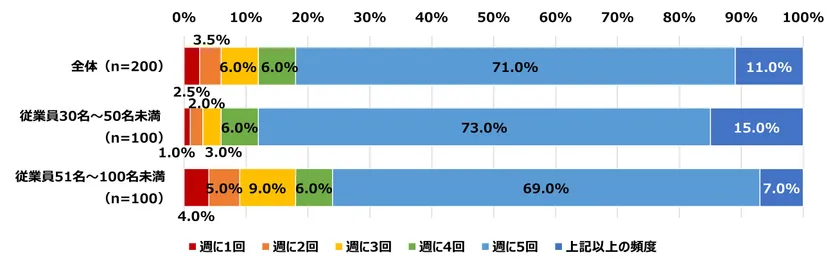 現在の出社頻度をお聞きすると最も多い回答は「週に5回」となり71.0%が回答しました。従業員規模で比較をすると、従業員規模30名~50名の企業で働く方は73.0%が「週に5回」と回答し、従業員規模51名~100名未満の企業で働く方は69.0%が回答しています。