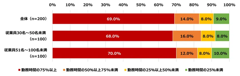 ●勤務時間のうちオフィスで過ごす時間の割合は「勤務時間の75%以上」が最多。