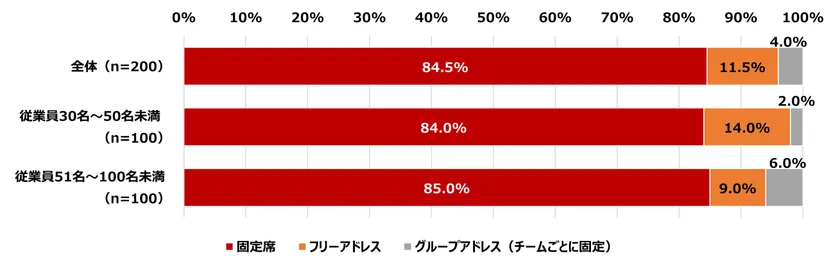 では、普段どのようなオフィスで過ごしているのでしょうか。まずは座席の形態をお聞きしました。その結果「固定席」が84.5%となりました。従業員規模に関わらず「フリーアドレス」や「グループアドレス」を導入している企業はまだ2割未満のようです。