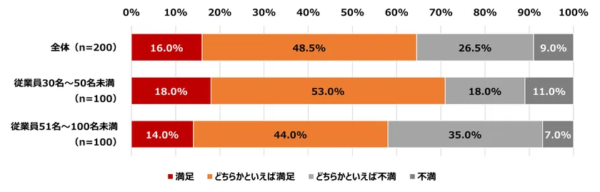 オフィスの満足度は満足計が64.5%となっています。3割以上の方がオフィスに対し不満を持っていることがわかりました。従業員規模で比較をすると、51名~100名未満の企業で働く方に不満を感じている方が多く、4割以上が回答しました。