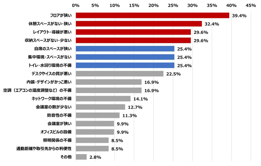 また、コロナ以前もあった「フロアが狭い」などの要素に加え、「自席のスペースが狭い」、「集中環境・スペースがない」、「トイレ・水回り環境の不備」などのコロナ禍ならではの回答も上位となっています。