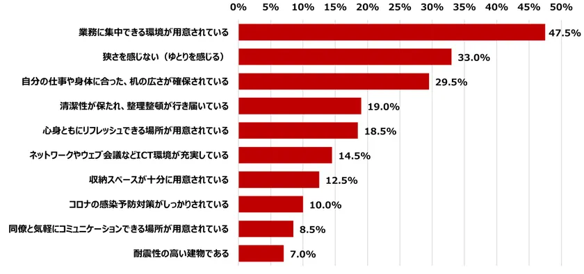 オフィスに求めるものは「業務に集中できる環境が用意されている」、「狭さを感じない(ゆとりを感じる)」、「自分の仕事や身体に合った、机の広さが確保されている」の順となりました。「狭さを感じない」よりも「集中できる環境」が多い結果となっています。