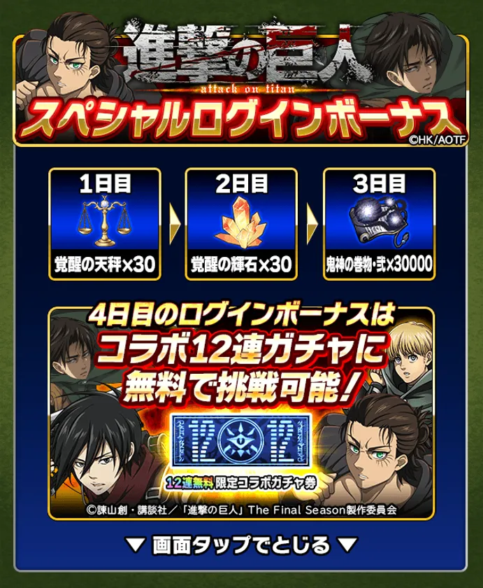 TVアニメ「進撃の巨人」The Final Seasonのキャラクター「超大型巨人」「獣の巨人」が敵キャラとして登場するイベントクエストをはじめ、「コラボガチャミッション」「スピードくじ」などが開催されます。