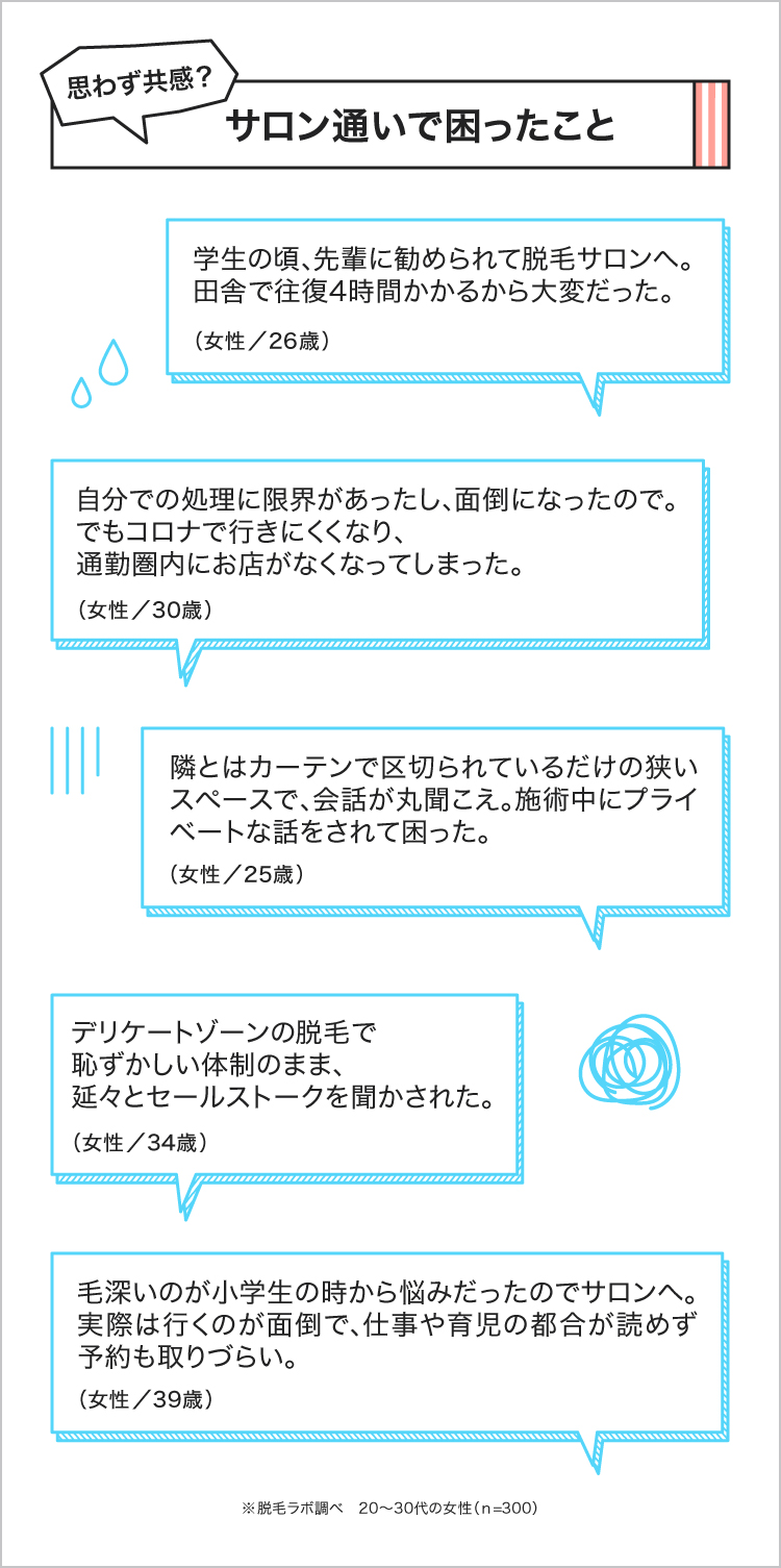 「毛深いのが小学生の時から悩みだったのでサロンへ。実際は行くのが面倒で、仕事や育児の都合が読めず予約も取りづらい」(女性/39歳)