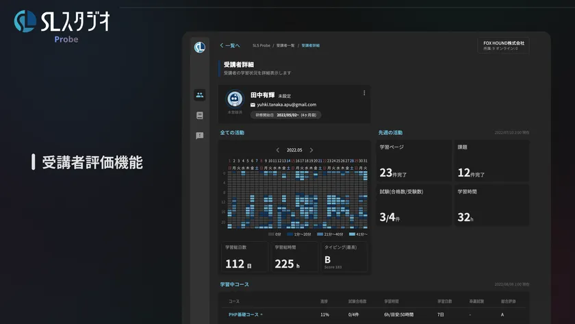 「SLスタジオ Probe」を活用することにより、IT系企業においてエンジニア研修を行なっている担当者は、SLスタジオで学習している受講者の評価が出来るのはもちろんのこと、受講者の傾向から担当者が行うべき指導の指針が得られ、実現できます。