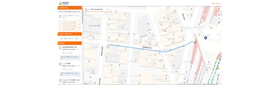 ・ルート検索ボタンを押すと、手段選択(徒歩、車)と出発地設定(現在地、任意の場所、付近の駅)が可能となり、選択内容に応じてルートが地図上に表示されます。