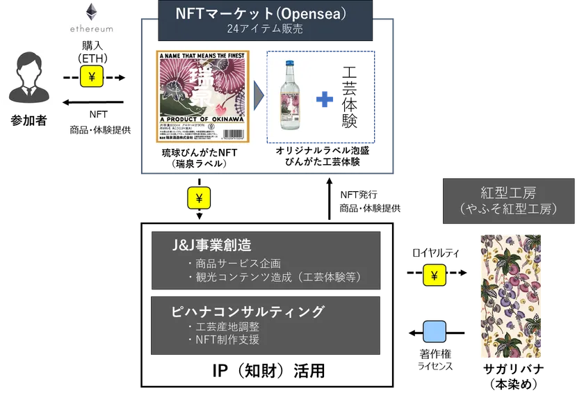 この取り組みの第1弾として、琉球びんがたラベルの泡盛購入権付NFTを2022年7月上旬に那覇市内で開催されたIVS(国内外のスタートアップ経営者・上場企業経営者が集う国内最大級のカンファレンス)にて展示・販売しました。琉球びんがたの知的財産(IP)は、連携するやふそ紅型工房及び一般社団法人琉球びんがた普及伝承コンソーシアムが提供し、IPの管理とNFTの発行をJ&J事業創造とピハナコンサルティングの両社で行いました。また、NFT購入者には、琉球びんがた工房訪問の権利もあわせて付与し、デジタル資産の枠を超えた価値を持たせ、地域における来訪者と産地の交流機会の創出も狙いました。