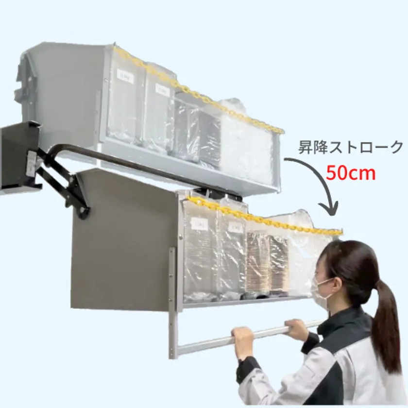設置位置から50cm降ろせます。手の届く高さまで降ろせるため、踏み台いらずで誰でも簡単に物を出し入れすることができます。
