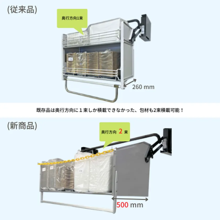 奥行が従来品の約2倍となったことで、収納量も約2倍に。かさばってしまうテイクアウト容器もたくさん収納、ストックできます。また、後傾した構造のため、昇降時に物が飛び出す心配もありません。