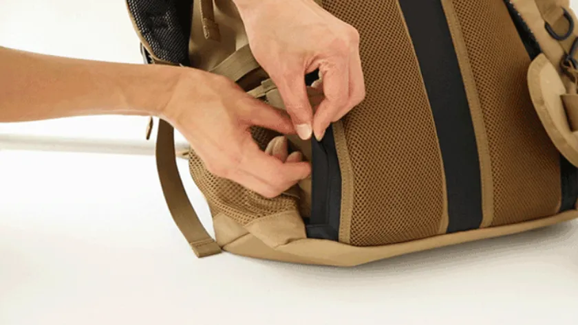 ヒップベルトは坂を登ったり、長時間歩く際、腰の負担を軽減してくれます。また、使わない時には巻いて収納できます。