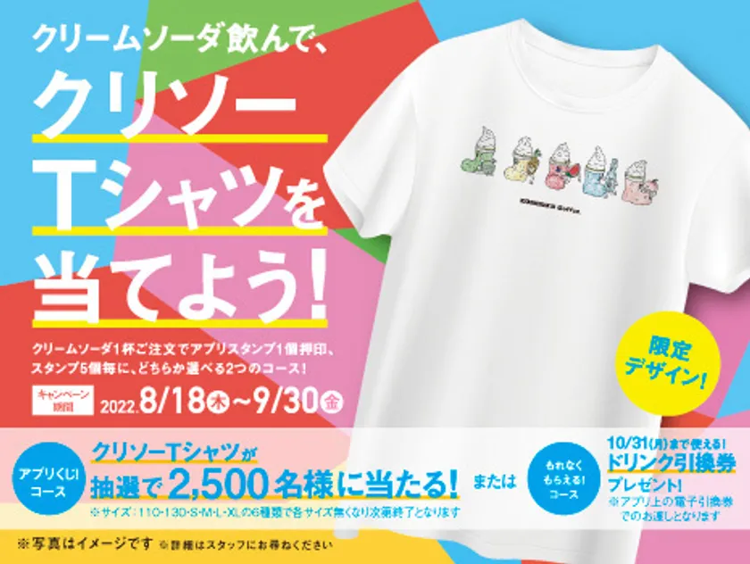 また、販売を記念してクリームソーダ1杯のご注文でコメダの公式アプリスタンプを1個押印、スタンプ5個で「アプリくじ!コース」と「もれなくもらえる!コース」2つのコースから選べるキャンペーンを実施します。「アプリくじ!コース」はフレーバーのイラストが可愛い限定デザインのクリソーTシャツを抽選で2,500名様に。「もれなくもらえる!コース」では、コーヒーチケット対象ドリンク19種から選べるドリンク引換券をプレゼントします。この夏はカラフルなクリームソーダで決まり!店内を涼しくして皆さまのお越しをお待ちしております。