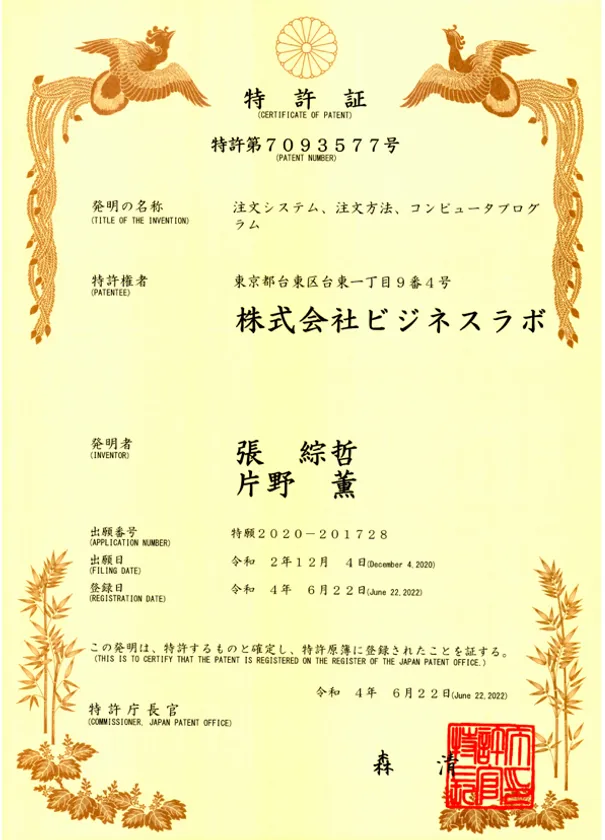 株式会社ビジネスラボ(代表取締役:張 綜哲、所在地:東京都台東区)の非接触セルフオーダーシステム「スマチュー」はこの度、システム内部機能の開発にて特許を取得いたしました。