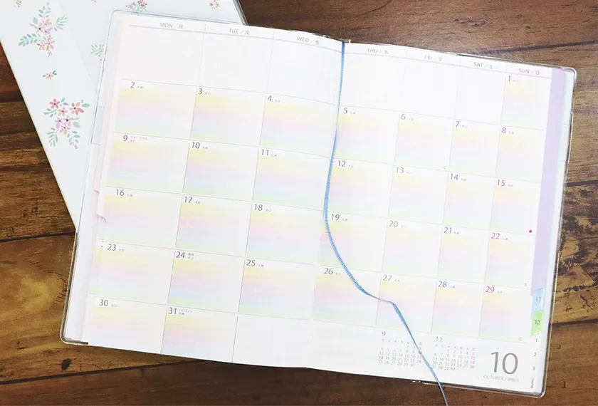 そして虹色のカラーデザインは、手帳を開くたびに明るい気持ちで使える優しい色のグラデーション。黒ペン1色で書きこんでも見やすくて可愛いと好評です。