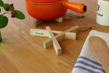 異なる3種類の木を組んで作った、小枝が集まったようなデザインの鍋敷き「寄木のトリベット」。組み合わせた木は、日本でも馴染みの深い、当社の家具や木製品の材料として使用している国産無垢材のサクラ・カエデ・ナラの3種類で、小さな材料も有効活用するとともに、敷地内で間伐した自社林材も活用するサスティナブルな商品です。それぞれの木の質感と使うほどに変化する風合いをお楽しみいただけるよう、無塗装で仕上げました。小さいながらも温かみがあり、食卓をやさしい雰囲気にコーディネートしてくれます。