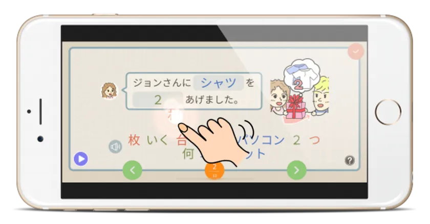 かわいいイラストや音声での問題提示など、日本語を楽しく学習できる工夫がこらされています。また、解答後すぐに答えを確認し、間違えなくなるまで繰り返し練習ができるので、学習項目をしっかり身につけることができます。スマートフォンでいつでもどこでも手軽に学習できるので、机に向かって問題集を開くのと違い、気軽に勉強に取り組めます。