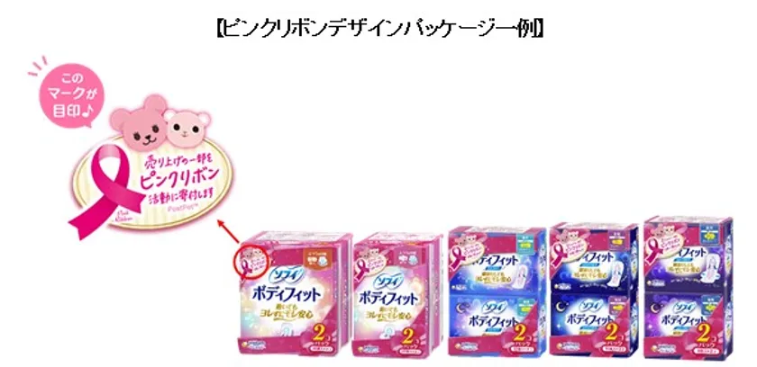 本取り組みの一環として、「ソフィ ピンクリボン活動」応援特設サイトでの乳がんに関する情報発信に加え、「ピンクリボン」デザインパッケージを発売し、その売上金の一部を寄付します。