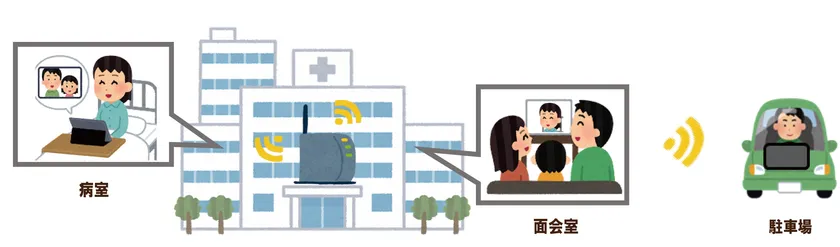 あらかじめペア設定された端末の1台を病室の患者様、もう1台を面会に来たご家族様にお渡しします。使用する場所で電源を入れると画面が立ち上がりすぐに面会を始めることができます。内蔵バッテリーで3~4時間動作するため施設内の様々な場所や敷地内の駐車場へも持ち運びが可能です。