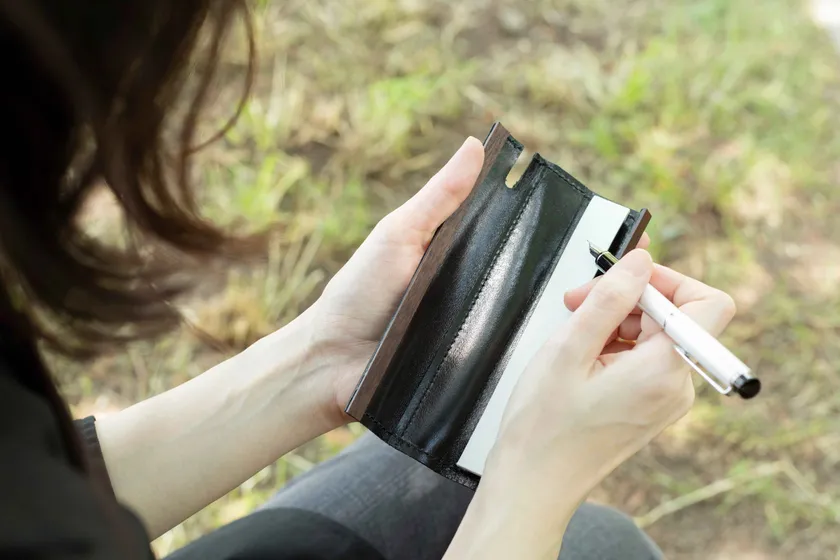 ・左側に万年筆やボールペンを一本収納できます。