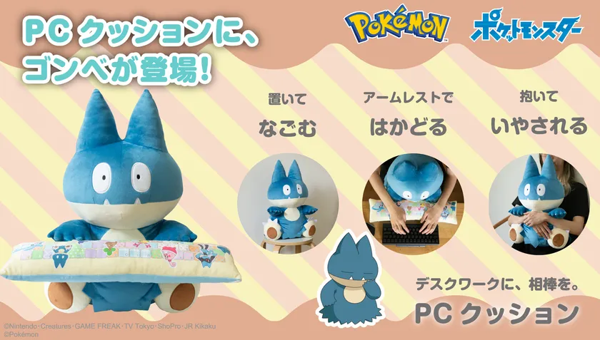 本商品は、『ポケットモンスター ダイヤモンド・パール』より登場したおおぐいポケモン・ゴンベをモチーフにしたPCクッションです。長時間のパソコン作業に最適な、ぬいぐるみ型クッションとアームレストがセットになっています。