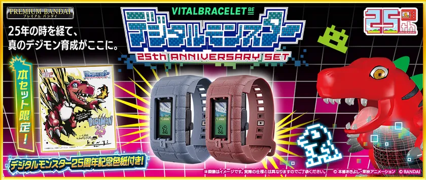カラダを動かすことがアソビに変わる新ウェアラブル型液晶玩具「VITAL BRACELET BE」より、デジタルモンスターの誕生25周年を記念したアニバーサリーセットを発売いたします。