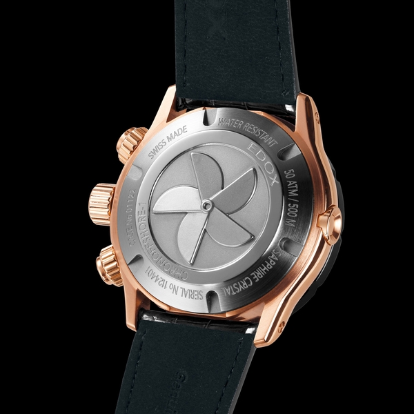 「1」のみを大きく表示したアイコニックなインデックスには、チャンピオンへの強いこだわりを示すと同時に、困難への挑戦を称賛する意味が込められています。また裏蓋には、パワーボートの推進装置であるプロペラを刻印。刻印によってできる凹凸が、腕との密着を防ぎ、快適な装着を可能にします。
