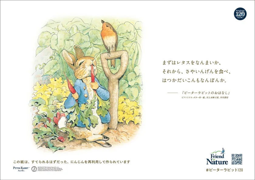 『ピーターラビットのおはなし』出版120周年をきっかけに、作者の自然を愛する想いを「Friend to Nature」という言葉にこめて、伝えていきます。ピーターたちの暮らす自然が、いつまでも守られますように。