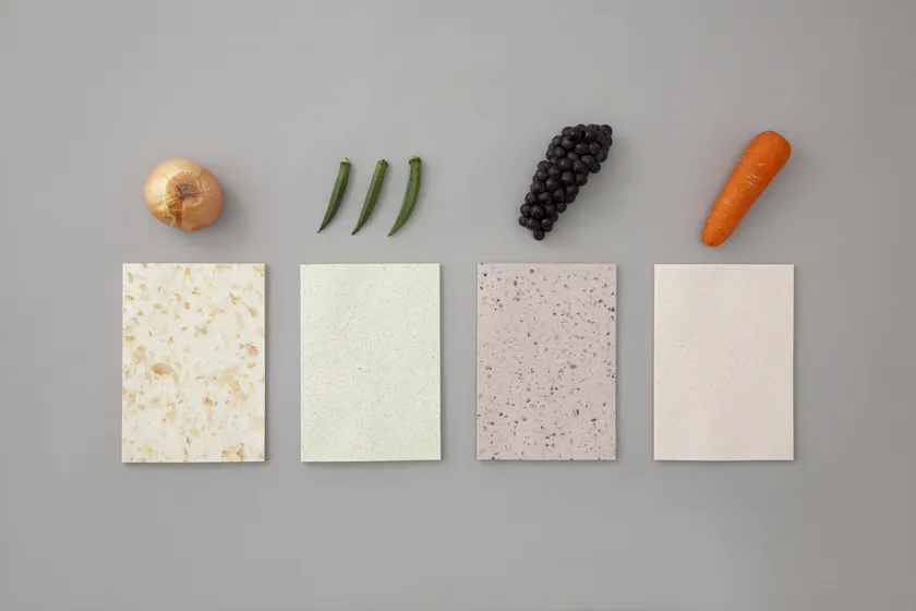 ピーターたちの大好物であり、ピーターラビットの絵本シリーズにも度々登場する色とりどりの野菜や果物の中から、たまねぎ、じゃがいも、かぶ、ラベンダー等8種類を使用し、『ピーターラビットのおはなし』の中の8シーンが、洋紙とも和紙とも異なるFood Paperの独特な風合いで表現されています。