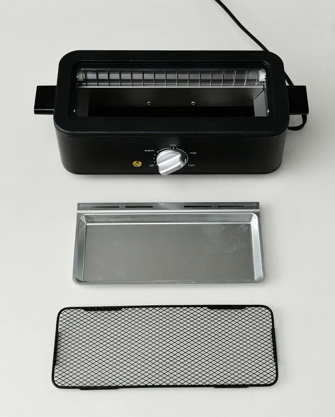 今回は、同じく煙を気にせずにご自宅で居酒屋気分を楽しめる、「HITORI-JIME GRILL」を開発しました。側面ヒーター構造を採用することで、焼き網から落ちたお肉やお魚の油がヒーターにかからず、煙の発生を抑えます。