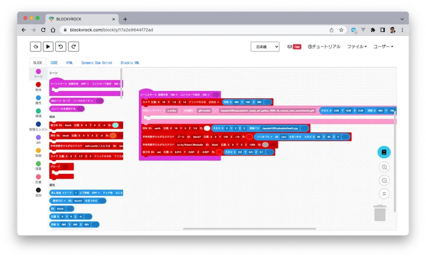 「BLOCKVROCK」は「自分の世界を手作りしよう」をテーマとして作られた、誰でも簡単に無料でオリジナルのVR/AR作品を作成できるツールです。アプリのダウンロードは不要で、WEBブラウザのみで利用できます。一般的なプログラミング学習では「HelloWorld」と文字を画面に出すだけのようなステップから始めますが、「BLOCKVROCK」では、プログラミングによってVRの世界に物体を作り出したり、物体を動かしたりするところからはじめるため、自分だけのオリジナルのVR作品を作成しながらプログラミングや3Dの表現、デジタルクリエイティブの様々な要素を実践しながら学ぶことができます。