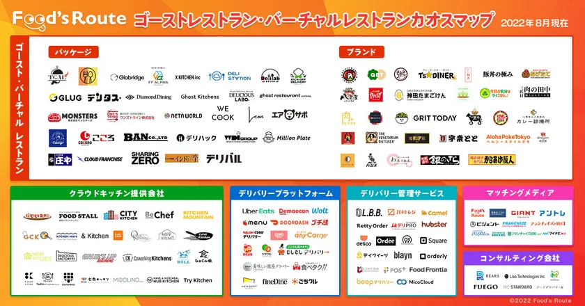 ゴーストレストラン・バーチャルレストラン、 クラウドキッチン提供会社、デリバリープラットフォーム、 デリバリー管理サービス、デリバリーブランドコンサルティング会社、 マッチングメディア等のカテゴリにマッピング