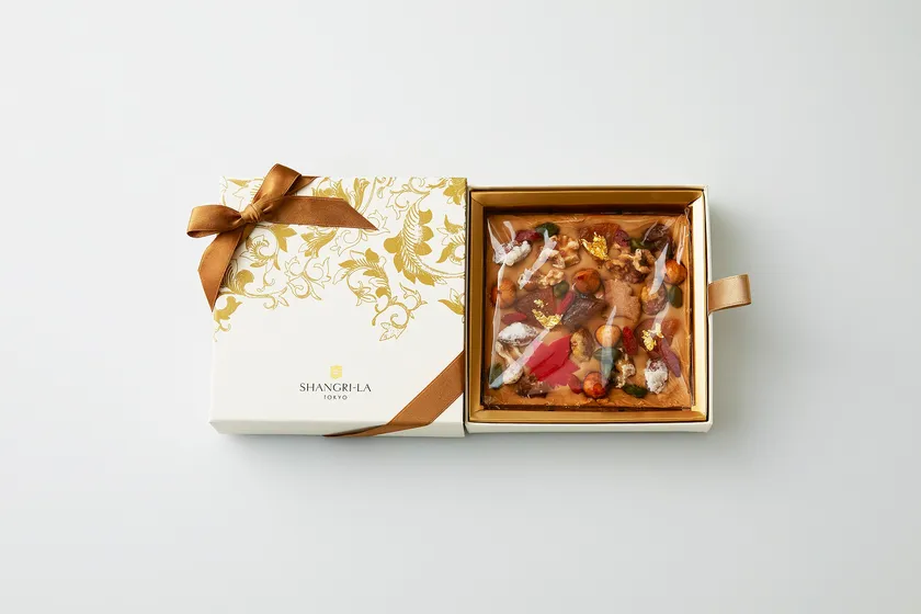 毎年恒例となっている秋限定のブロンドチョコレートには、ミックスナッツやクコの実、アプリコットをトッピング。口に含むと、香ばしくほんのりとした甘さの中に上品な塩気を感じられ、独特な味わいが広がります。また、モミジを型取った緋色のチョコレートのデコレーションが、美しい紅葉の季節を演出。お子様のおやつにも、ワインなどお酒のおともにもどうぞ。