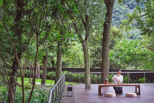 木々の間を縫うように水路が張り巡らされたウォーターガーデンのテラスで、お茶を味わいます。茶葉は、谷關から近い八仙山(バーシェンサン)の紅茶と梨山(リーサン)の高山茶を選びました。口に広がる味わい、手から伝わる茶杯の温度、お茶を注ぐ音、そして茶葉の種類や蒸らす時間によって変化する色や香りに五感を研ぎ澄せることで、心穏やかなひとときを過ごせます。