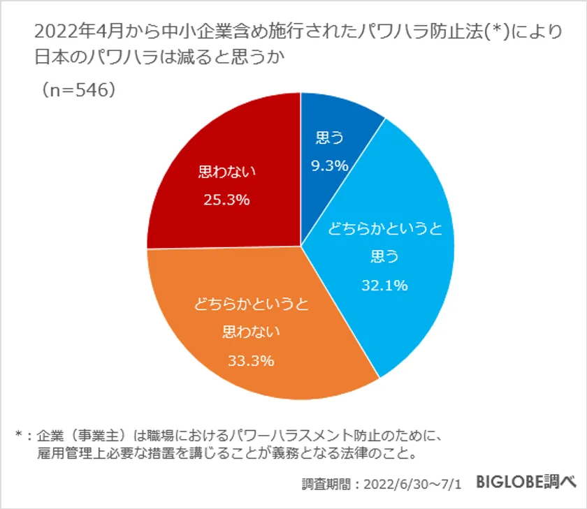 全国の10代(18歳以上)~50代までの有職者の男女546人に、「2022年4月から中小企業含め施行されたパワハラ防止法により日本のパワハラは減ると思うか」と質問したところ、「思う」「どちらかというと思う」をあわせた回答は41.4%であった。