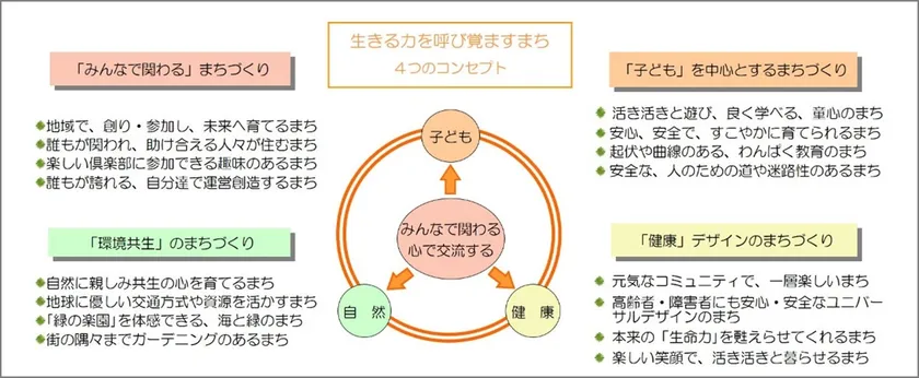 まちづくりにあたり、「環境共生」「健康」「子ども」「みんなで関わる」の4つをコンセプトとして掲げ、「生きる力を呼び覚ますまち」を目指してきました。中でも「子どもを中心とするまちづくり」に力を入れていて、子どもがのびのびと健やかに育つことができる工夫が施されています。まちの真ん中には、緑豊かな「アイランドシティ中央公園」があるほか、まち全体にオープンスペースを設け、人々が気軽に集い、子どもたちが駆け回り、遊びやすい環境が整えられています。