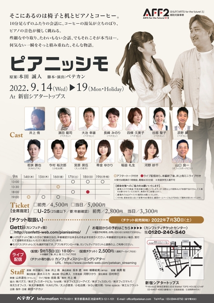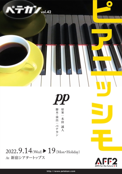 ペテカン(主宰:濱田龍司)主催、ペテカンvol.42『ピアニッシモ』が2022年9月14日 (水) ~2022年9月19日 (月・祝)に新宿シアタートップス(東京都新宿区新宿3丁目20-8 TOPS HOUSE 4F)にて上演されます。