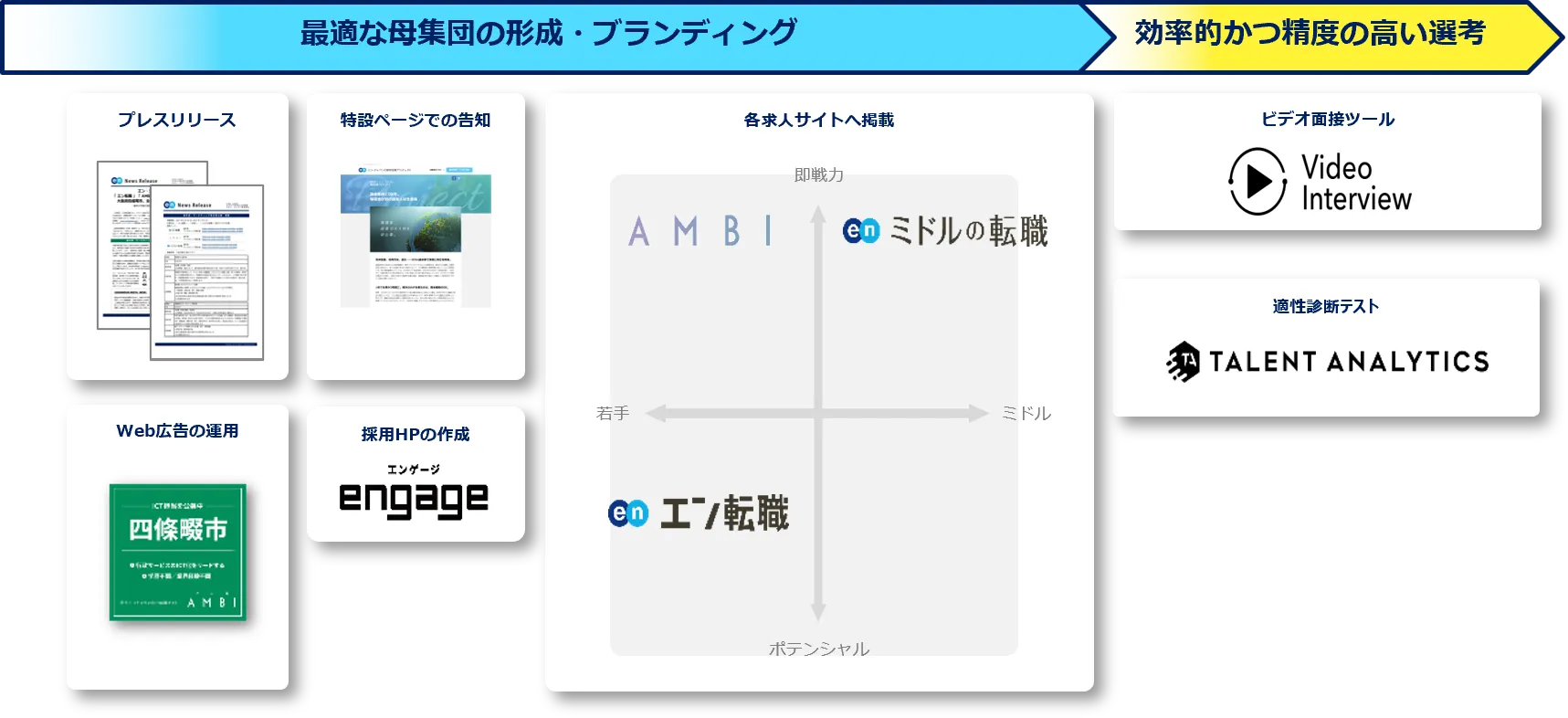 プレスリリースや特設ページ、採用HPの作成、Web広告での告知に加え、各求人サイトでの集客サポートを実施いたします。『エン転職』『AMBI』『ミドルの転職』とターゲットの異なる3つの求人サイトを活用することで、ターゲットへ網羅的に求人を届けます。ビデオ面接ツール『Video Interview』、WEB適性テスト『Talent Analytics』も提供。選考フローの支援を通じて、求職者と同市の最良なマッチングを実施します。