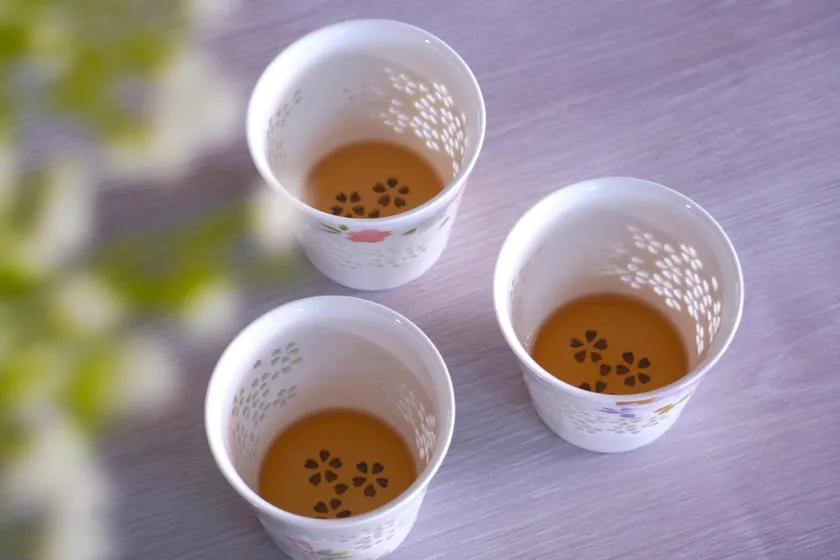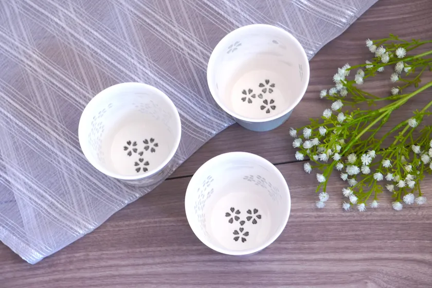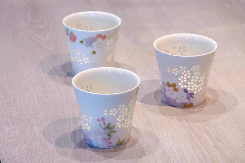 (万華鏡ロックカップ 宇野千代シリーズ 左から 花あかり、華ざくら、なごみ桜)