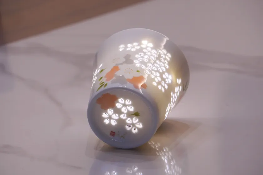 そのまま置いても、窓や照明の光で彫りによる光の柄を楽しむことができます。また、キャンドルやLEDライト、光るコースターなどを用いれば、カップ全体から光が漏れ、ランプシェードのような使い方にもできます。